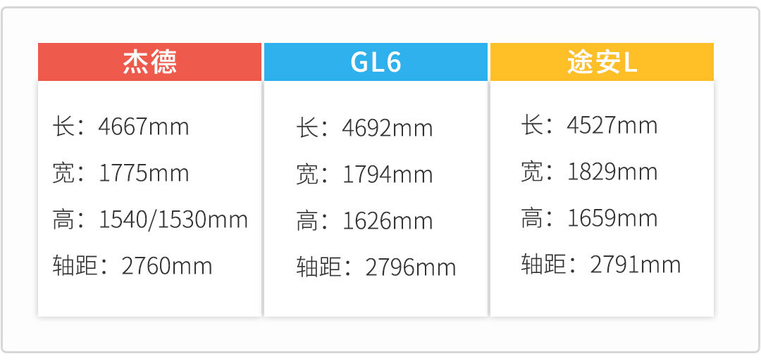 尺寸方面,杰德撤出MPV阵型是有道理的,本着宁做鸡头不做凤尾的原则闯入紧凑型车的阵型,另外GL6在车身长度、轴距方面占优,途安L得益于方正的造型,有着不错的头部空间,和横向空间。