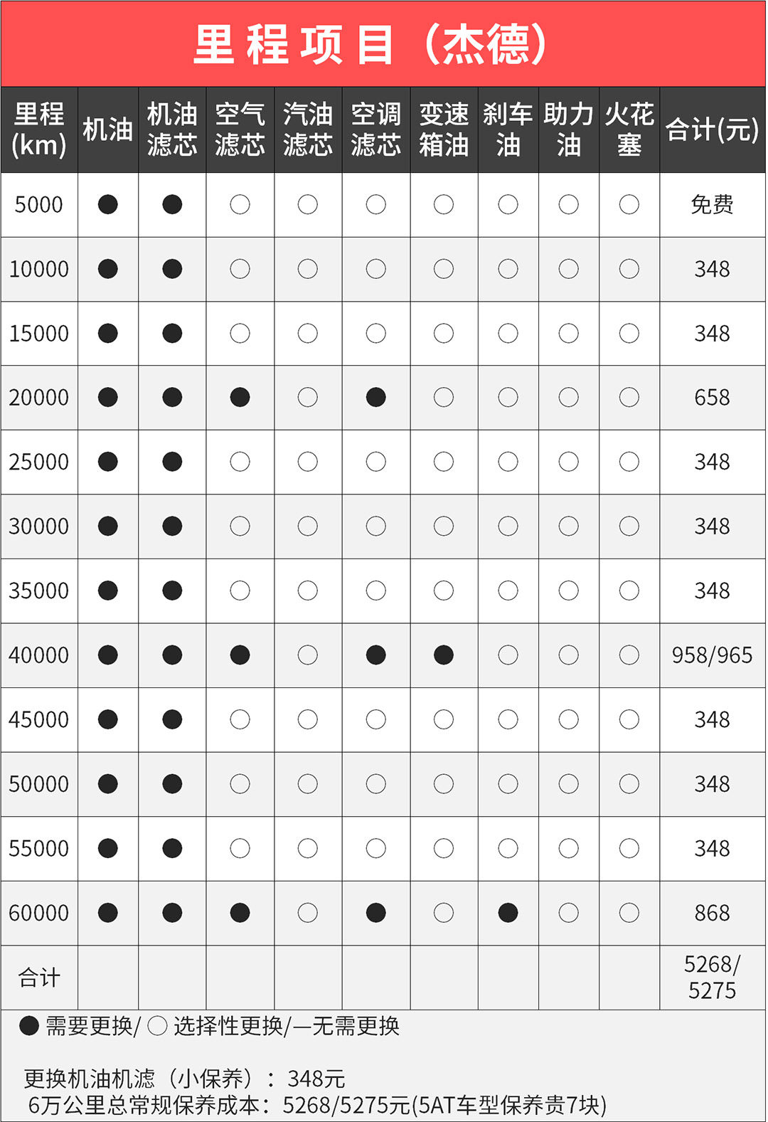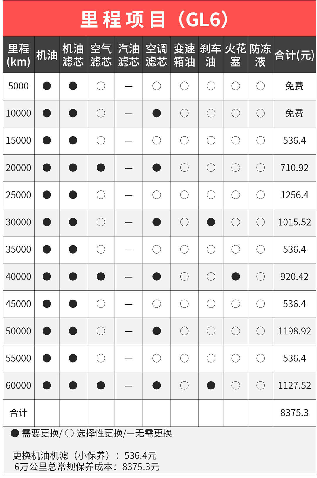 三款车的详细保养里程、项目、价格直观地列出来了,作为消费者最看重的还是价格,途安L>别克GL6>杰德,由此感叹家用车保养还是日本车便宜。