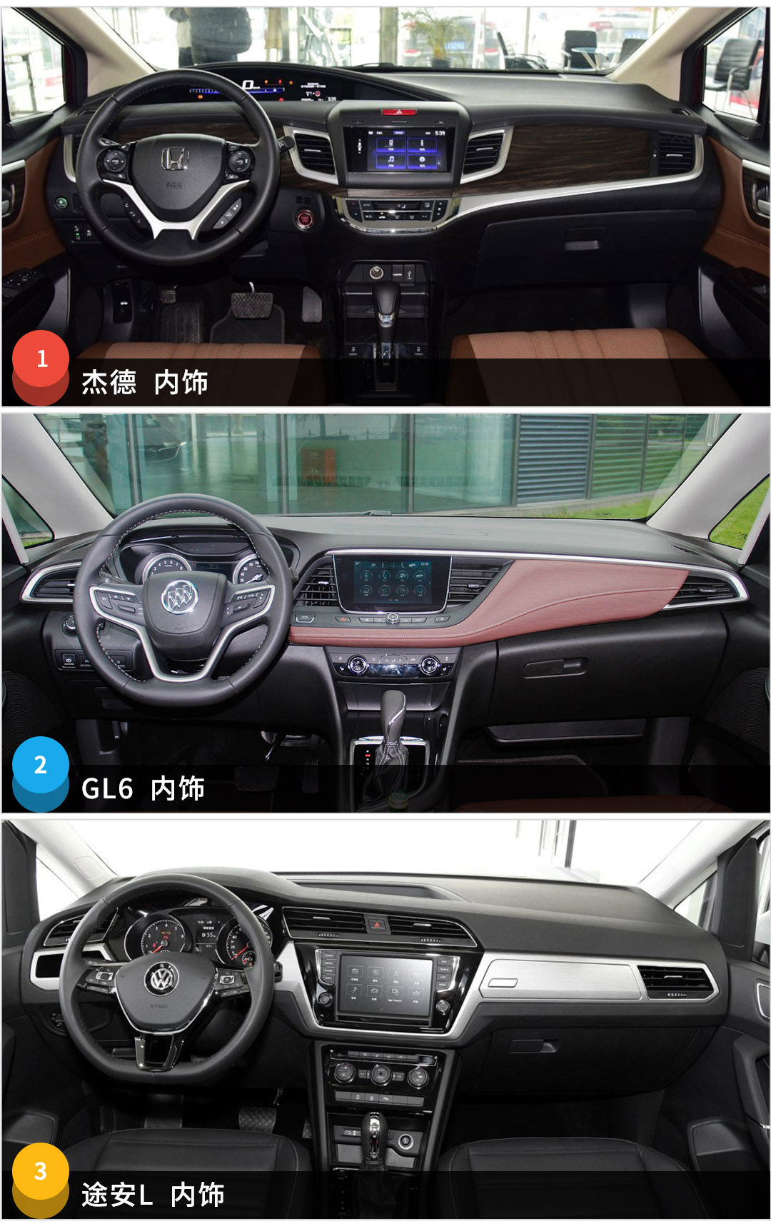 内饰方面,杰德中控台大片木纹饰板,显得很有质感,搭配超大的行车显示屏,尺寸偏小的方向盘操控起来非常灵巧;GL6内饰用料更为厚道,精细的缝线设计,高级感营造得相当不错;途安L中控按键分区明确,适合驾驶盲操,银色装饰面板,减轻了黑色内饰沉闷的感觉。