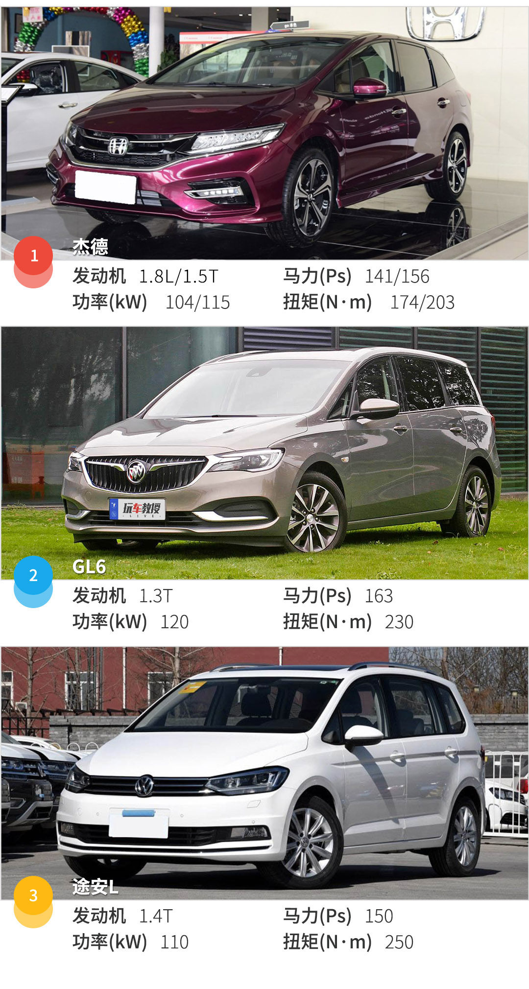 动力方面,GL6>杰德>途安L(马力对比),三缸发动机其实并没想象中糟糕,然而杰德这个动力总成更加省油更加平顺,途安L在扭矩上大比分胜出。三台车满载的时候,动力也够用,不存在有关空调榨动力的操作。