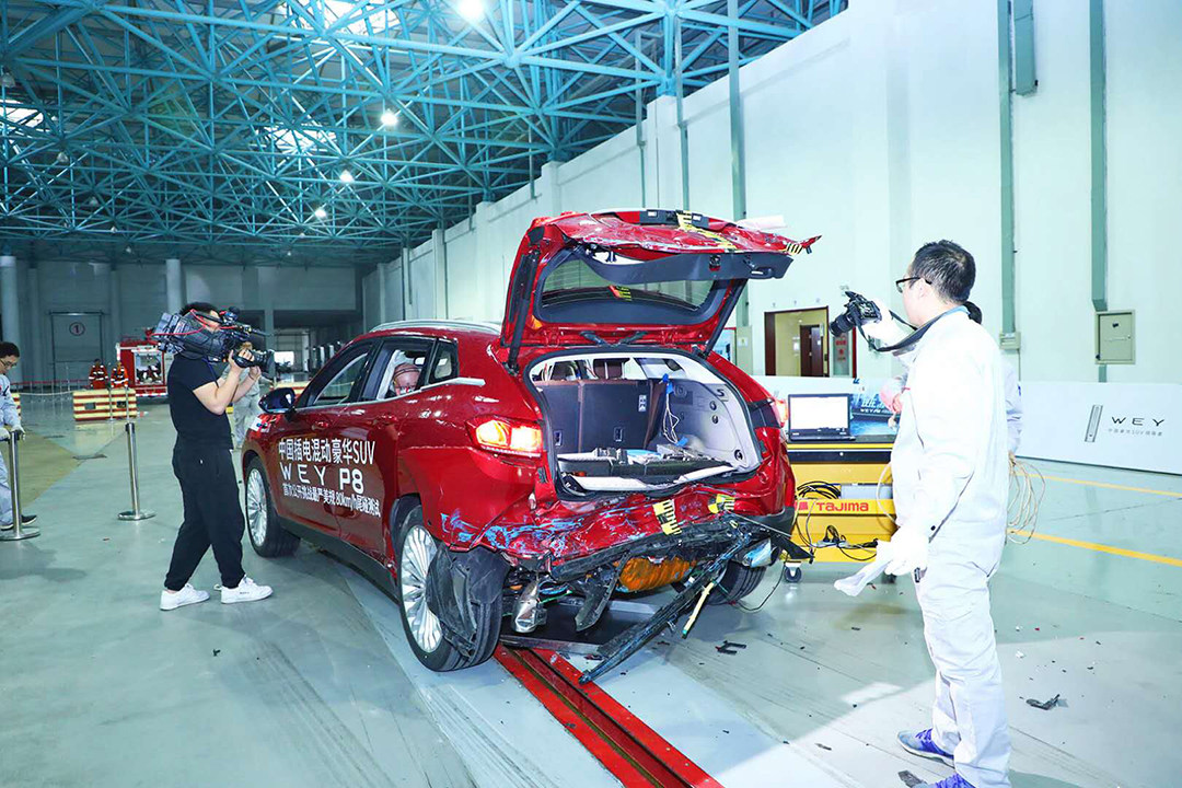 新车在正式上市之前,官方向媒体首度公开挑战美规80km尾部碰撞测试,向大家展示了WEY P8在安全性能方面的表现。碰撞后如图所见,A、B、C柱结构完整,且四个车门可以正常开启,放置于后尾箱下方的电池组保护完好,未见电池短路以及起火现象发生。