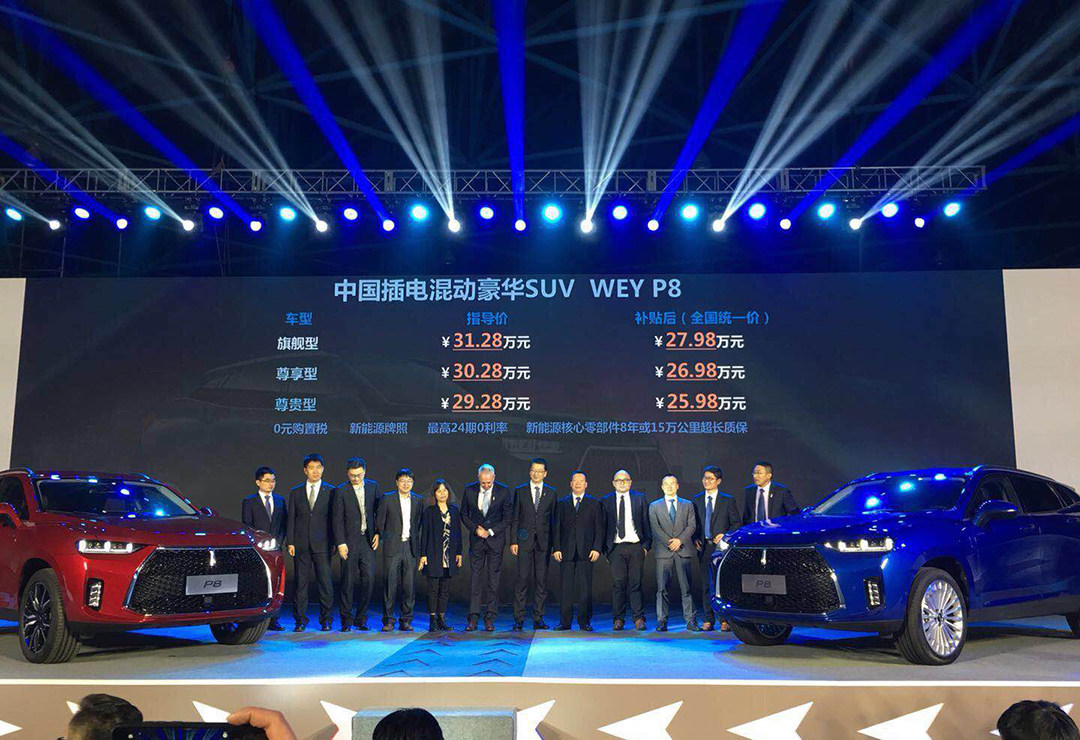 WEY全新SUV产品——WEY P8今日正式上市,共3个版本,补贴后售价为25.98万—27.98万,该车定位于插电混合动力豪华SUV,车身体积与WEY VV7相近,新车的性能可以做到6.5S破百以及百公里综合油耗为2.3L。