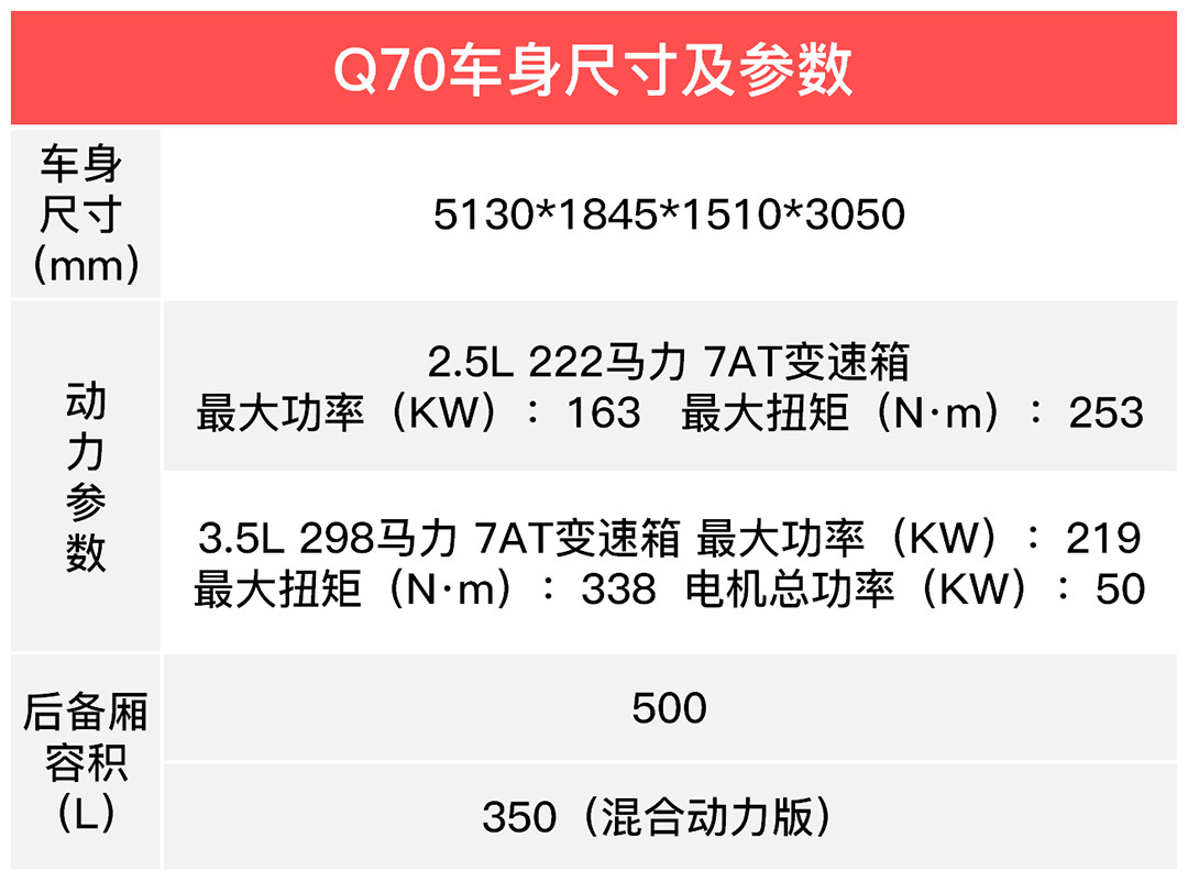 Q70搭载的2.5LV6自然吸气发动机加上7AT手自一体变速箱的这个动力总成,绝对不会有开中大型豪华车所给你的平庸、无趣,当你把模式调到SPOERT档的时候,英菲尼迪潜藏在骨子深处的运动因子将会被唤醒,你会发现,Q70这么大的一台车都会给你带来无穷的驾驶乐趣。