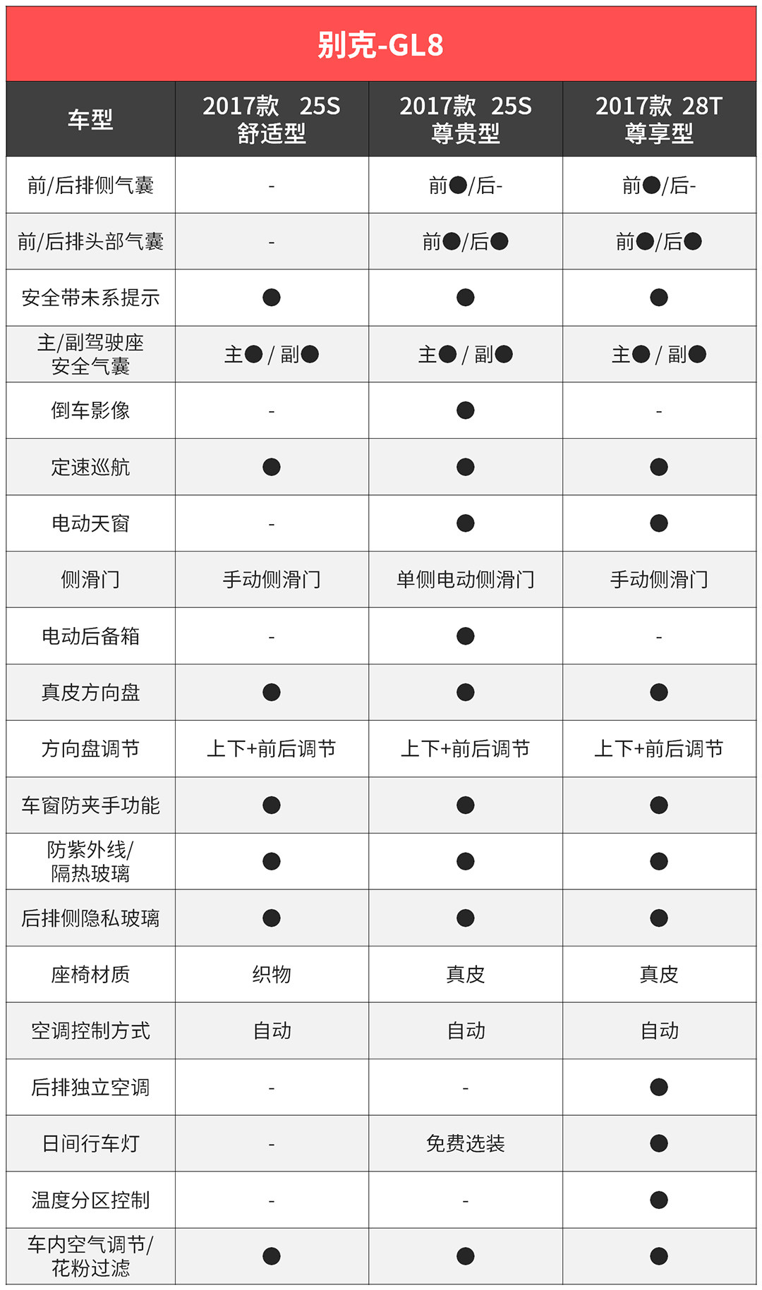 商务MPV也能家用,家用车的要求是什么?空间要够大,乘坐要舒适,安全配置要高还能偶尔来一个长途自驾游,那么,GL8的空间、乘坐体验都是众所皆知的了,至于安全配置,请看下表。
