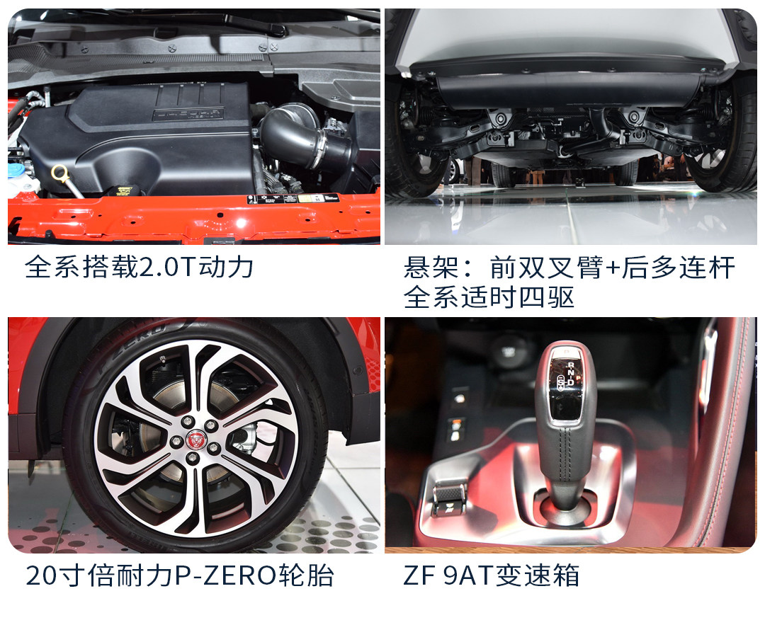 动力系统部分,新车将分别搭载2.0T高低功率版本涡轮增压发动机,其中高功率版最大输出功率183kW(249Ps),低功率版最大输出功率147kW(200Ps)。海外版上的那台221kW,400N·m的超高功率版2.0T版不会在国产版上出现。传动部分,与之匹配9速自动变速箱,并配备一套适时四驱系统。在这个级别上,E-PACE的动力参数还是很可观的,预计驾控体验将成为其产品未来的重要宣传部分。