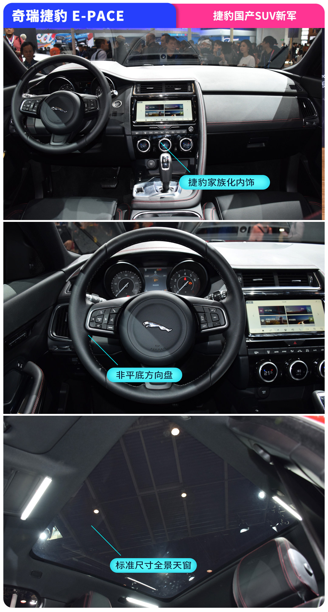 内饰方面,国产捷豹E-PACE延续了捷豹家族式内饰设计风格,并将配备当下流行的全液晶仪表盘及三辐式多功能方向盘。此外,包括多媒体中控液晶屏、多区自动空调、驾驶模式选择以及车道偏离预警系统等丰富配置也将配备在新车上。但国产版本是否会那么厚道我们就不得而知了,毕竟捷豹在国内除了“七折豹”以外还有个外号叫“加钱豹”。