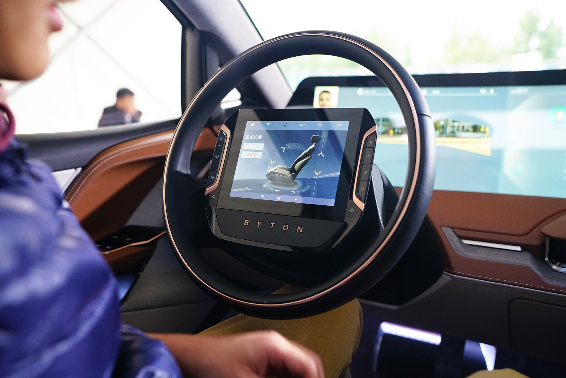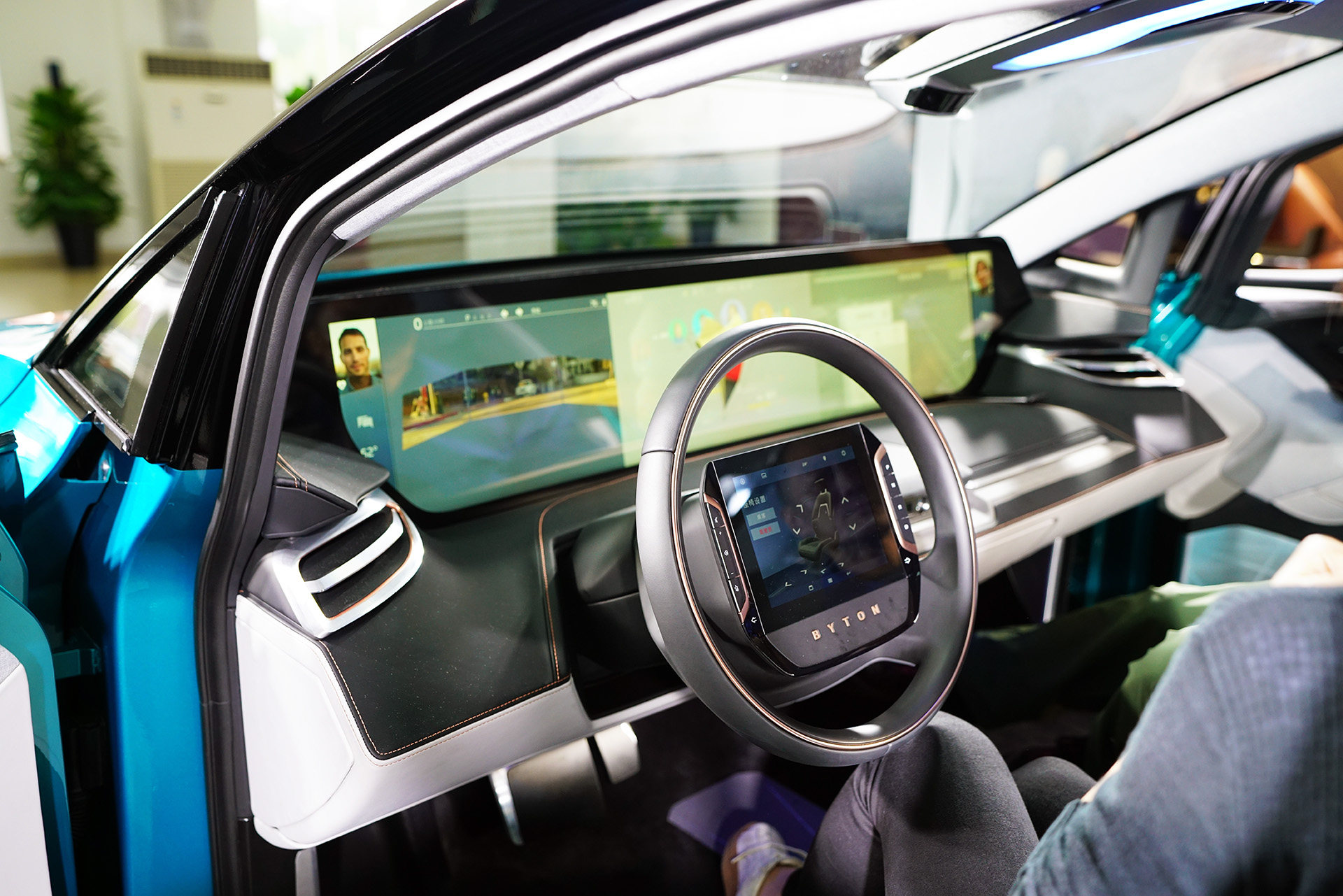 进入拜腾概念车内,教授第一眼便感受到了领先其他车企10年的厉害之处,长125cm、高25cm(49英寸)全面共享屏尽收眼底,这是量产车一定会保留的配置。这么大的屏幕,为了操作安全,拜腾还专门开发手势识别系统方便使用。配合主驾方向盘的触控显示屏,后排两块显示屏,以及首创的前排可向内偏转12°旋转座椅,无论是在车内举行小型会议,甚至约上三五知己在车内看球,这一切都可在拜腾概念车内实现。