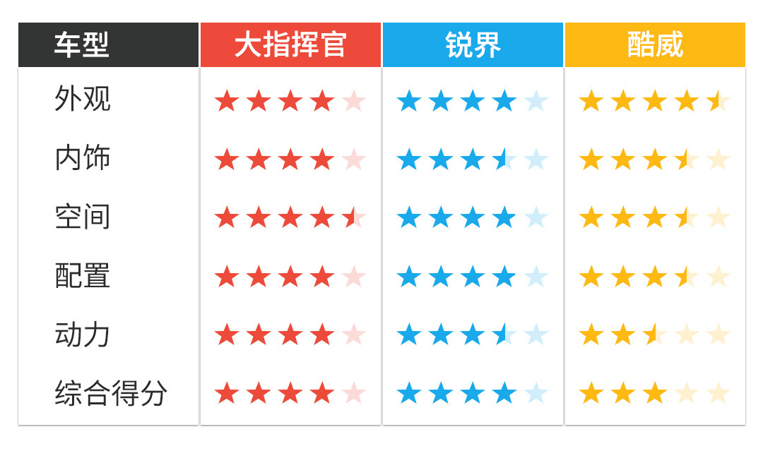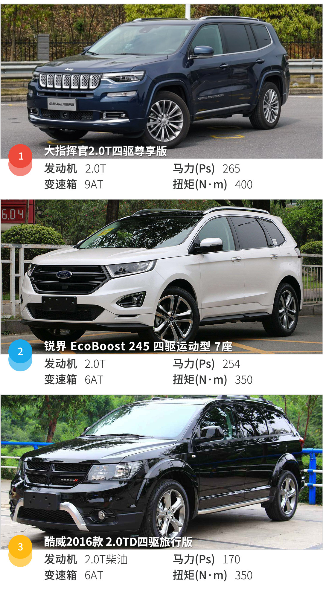 一轮对比下来,大指挥官是实用层面的最佳选择,我们也很期待它在市场上的表现!而锐界凭借出色的底盘可以让它在市场中有一席之地。而道奇酷威只能属于纯美系车情怀的选择了,它是三辆车里面最“美国”的,但动力较差实用性比较弱。那么你们会选择哪辆呢?!