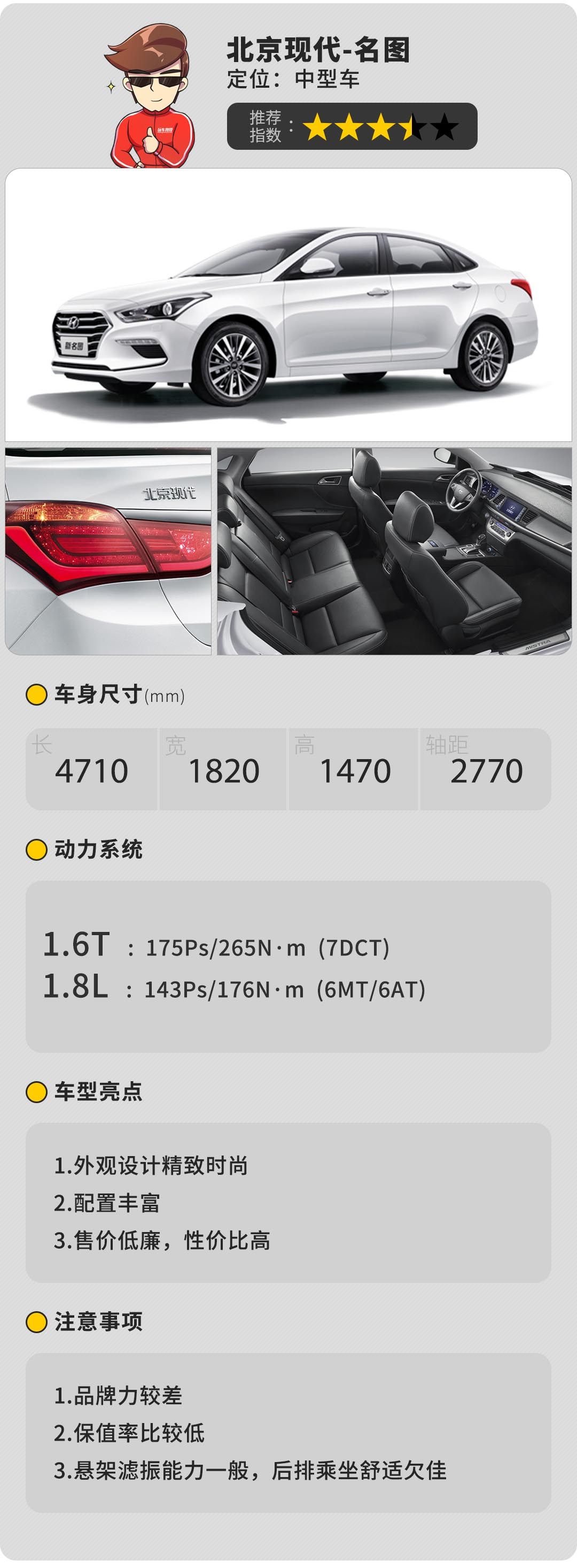韩系车历来以高颜值、高性价比著称,名图就是一个很典型的例子,其价格已经下探到普通合资品牌紧凑型轿车的区间,而它指导价为14.98万的1.5L自动智能型GLS次低配车型已经拥有电子车身稳定系统,后驻车雷达,倒车视频影像,发动机启停技术,上坡辅助,电动全景天窗,自动空调等丰富配置,动力能够满足家用,乘坐空间宽敞,虽然底盘滤振不咋地,但是加上2万多的优惠,还买啥紧凑型轿车呢?