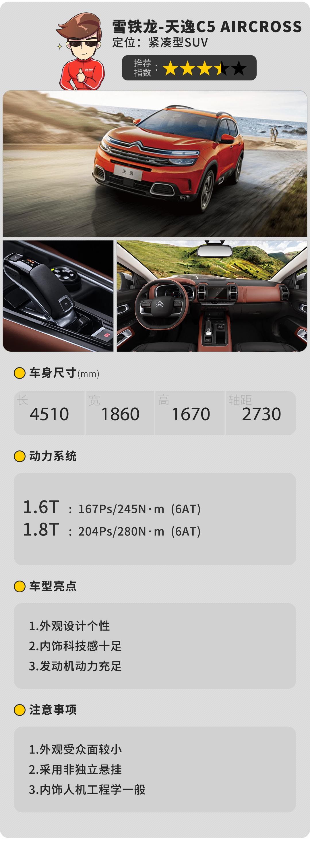 法系车的“浪漫”虽然不是每个人都能理解,但是其性价比消费者可是都看在眼里,天逸C5刚上市那会较低的指导价可谓是引起了一大波的关注,其指导价为16.97万的次低配350THP时尚型拥有比较丰富的配置,其拥有前后排头部气囊,倒车影像,发动机启停技术,上坡辅助,电动全景天窗,无钥匙启动/进入系统,真皮方向盘,液晶仪表盘等,再加上其均衡的性能,作为家用车来说既不容易和别人“撞脸”,同时丰富的配置令实用性大大增加,还是非常值得入手的。