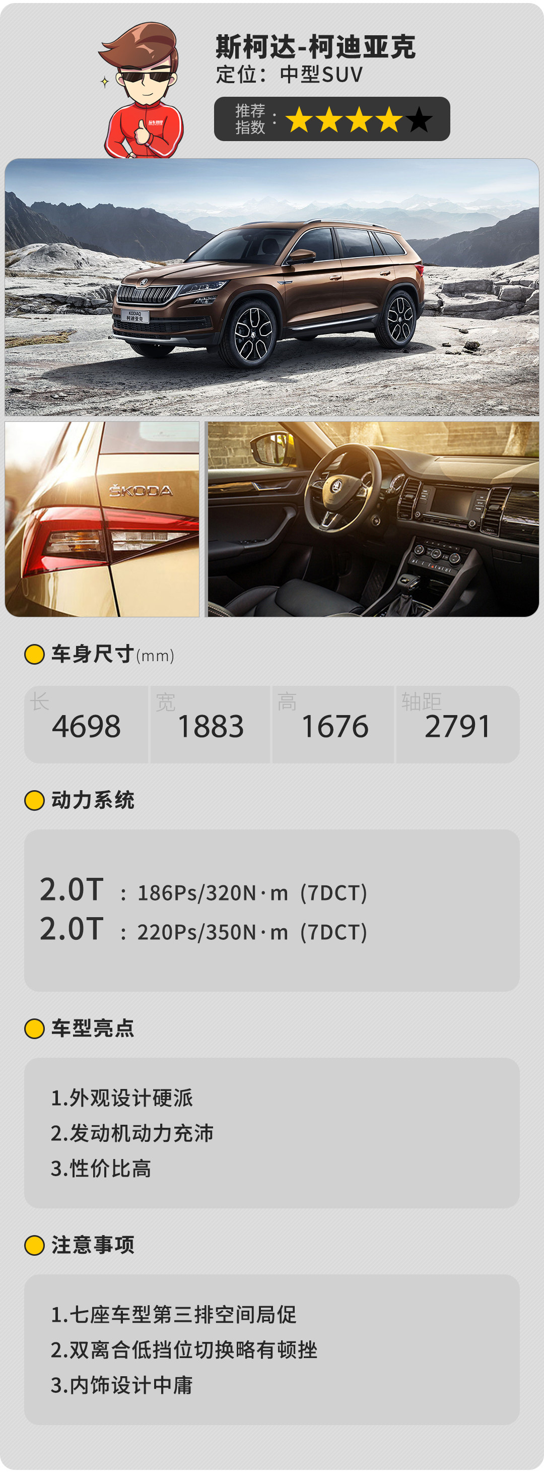 虽然斯柯达的名声在国内不如大众响亮,但是斯柯达许多车型和大众都是同平台生产,采用的发动机与变速器都是一样的,并且售价更低,柯迪亚克就是其代表,不仅拥有五座以及七座车型,指导价为20.98万的TSI330 5座两驱舒适版次低配车型拥有胎压监测,定速巡航,倒车影像,疲劳驾驶提示,上坡辅助,自动驻车,自动空调,温度分区控制等实用的配置,采用大众的动力系统也有较高的可靠性,想体验德系品质的话柯迪亚克是一个非常不错的选择。