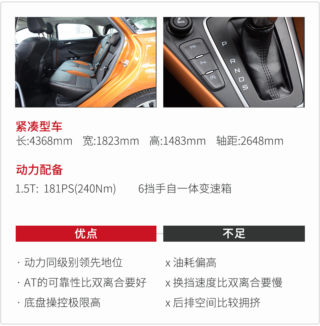 虽然福克斯1.5T的马力是同级别处于领先地位,但是也受制于6AT变速箱的使用。从可靠性的角度来看,6AT确实比同级别的双离合要可靠,但从发挥性能的角度来看,会影响那么一秒半秒的百公里加速时间。不过从驾驶者的使用角度来看,可靠性远比“快一秒”的性能重要。不过,后排使用率高的话,空间还真是一个问题,会影响不少的舒适性。