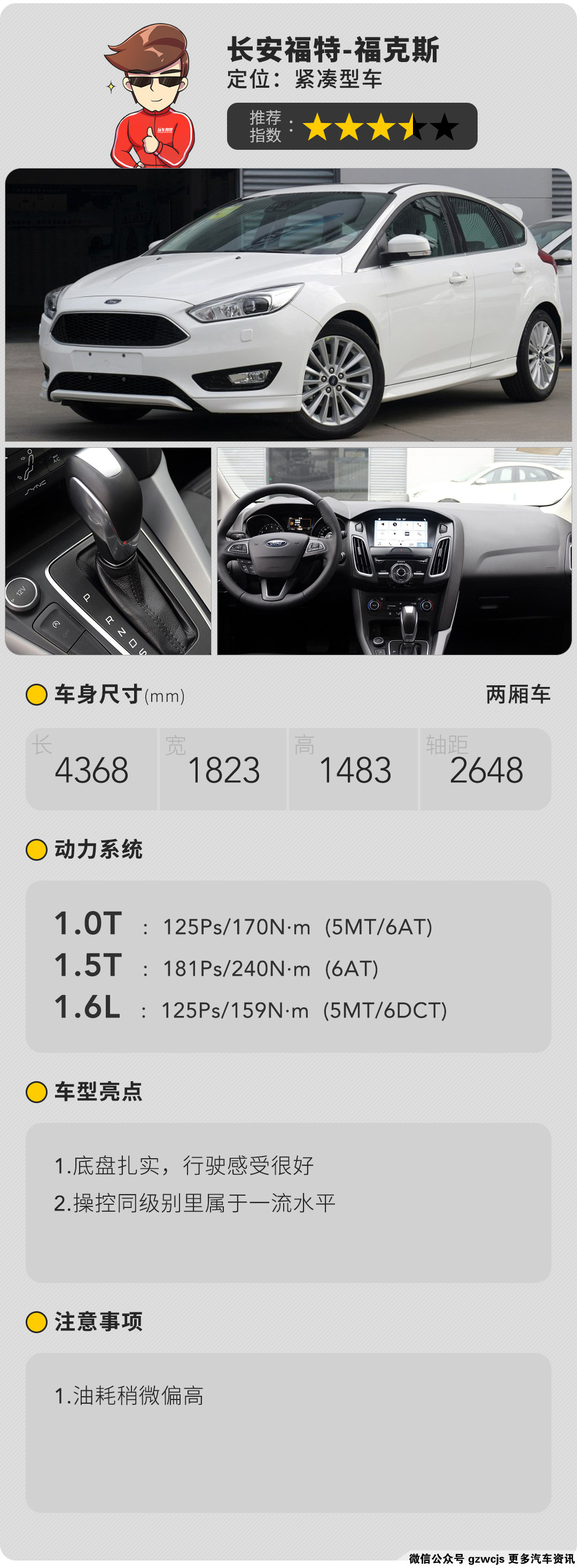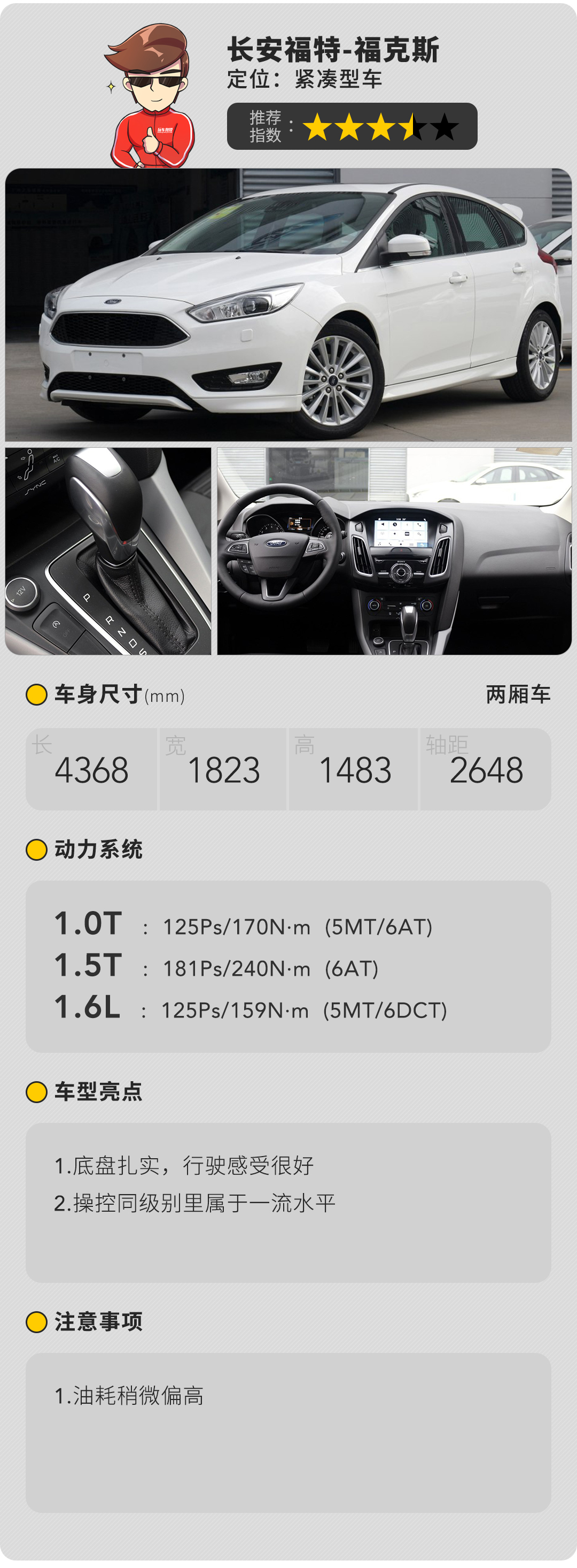 福克斯自上市之初就以运动来给自己定位,而如今它将这两个字贯彻得更加透彻。酷似阿斯顿·马丁的前脸让人无法拒绝,侧面造型简洁不失力量感,整体给人就是一台性能车的感觉。内饰风格十分前卫,细节做得也很不错。此外运动版还提供了运动风格的座椅,包裹性和支撑性都值得称道。动力方面除了有1.5T和1.6选择外,新增了1.0T EcoBoost涡轮发动机,驾驶感受也是偏向运动,车辆与与驾驶员的沟通非常好。这次北京车展发布了新的福克斯,有兴趣的话可以进入玩车教授的小程序来了解详细情报,说不定会有惊喜哦。
