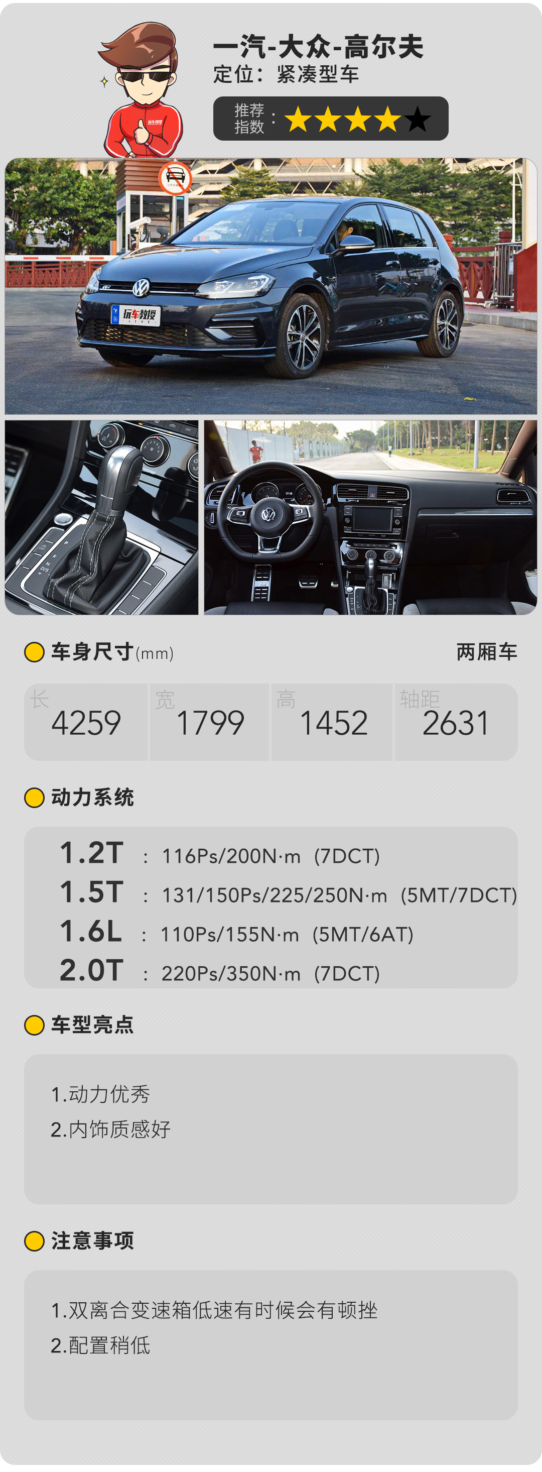 高尔夫是一款有着悠久历史的车型,目前已经发展到第七代。整车依然保持了高尔夫系列那种风格,低调而务实,但又不显得呆板。第七代车型相比第六代变化不大,只不过更加有精气神了。对于1.4T车型来说,还提供两款R-Line车型,看起来运动感十足。内饰上浓浓的大众家族风格,材质用料很足,手感和工艺也让人满意。提供4种发动机和3种变速箱任君选择,其中最推荐1.4T车型,配置比较丰富,日常使用舒适度高,动力上虽然有分高低功率版本,但都能满足日常家用,加速也很出色,而且还能满足那一点点小“激情”。