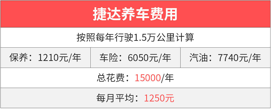 如果说比亚迪F3是受限于预算的无奈之举,那么捷达绝对是放心之选。首付3万,我们一起来看一下每月养车还贷的费用。当然是选一辆自动豪华版车型提升一下档次,现在全国各地优惠力度均有3万左右。裸车+购置税=86151元,减去首付3万,即每月还贷1082元,再加上养车的费用,一个月平均花费2332元。