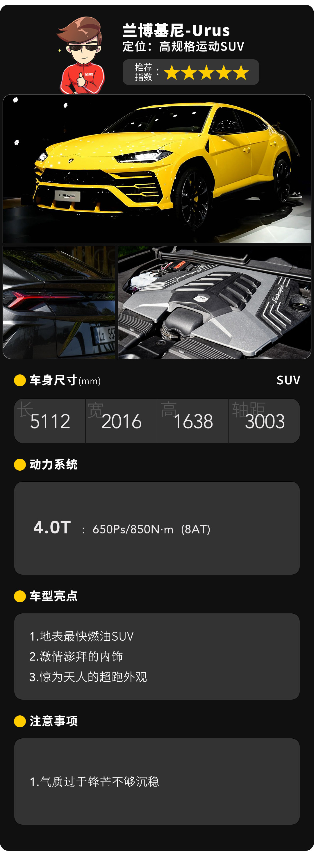 其实这三台“天之骄子”都是以大众MQB Evo平台打造的,也是用一样的电子防侧倾系统,但它们却能挥发出自家品牌的韵味,无可否认兰博坚尼Urus是一辆非常强悍的产品!但教授不认为它会给对手们造成很大的影响,因为它们都各具特色,在不同的领域都有极致的表现,而唯一相同的是足够“贵”好让土豪们炫耀,土豪你们怎么看呢?!