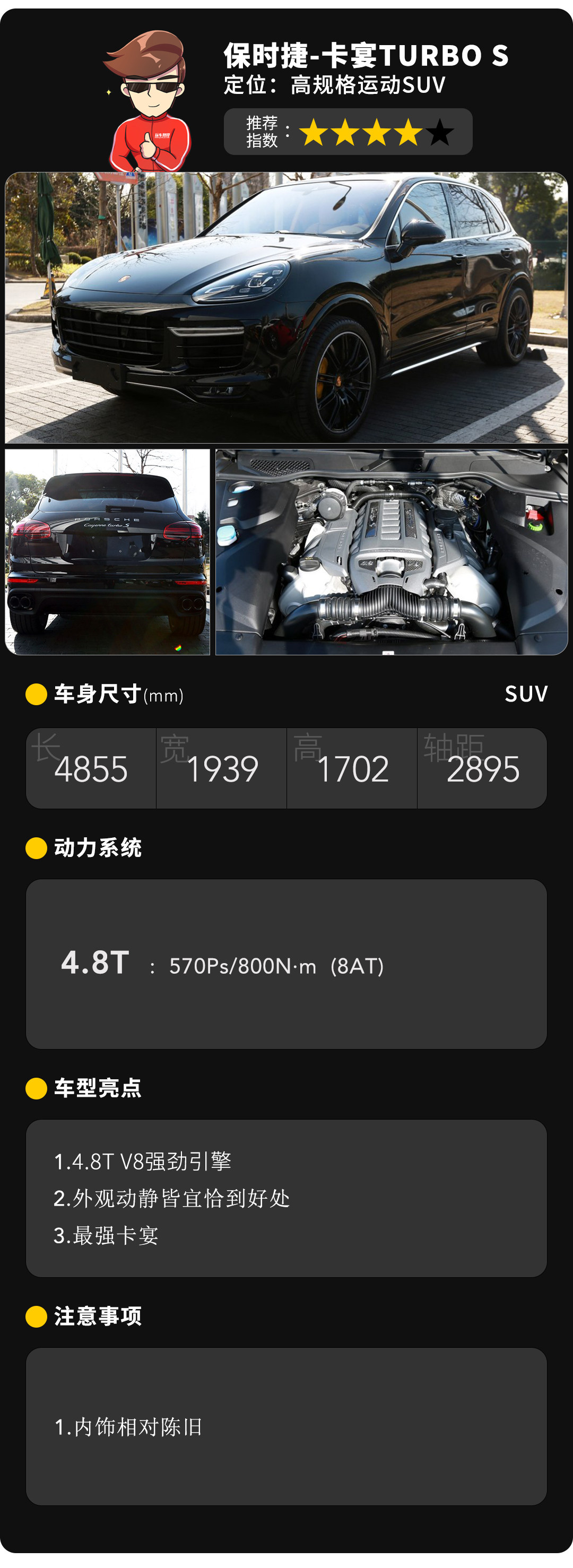 这颗4.8T引擎是非常强劲的,即使Urus也只是用改进版的18款Cayenne turbo 4.0T引擎而已,所以大可不必担心 Cayenne turbo S的表现,要知道,它以4.1秒的零百加速统治了最强最快SUV很长的一段时间!