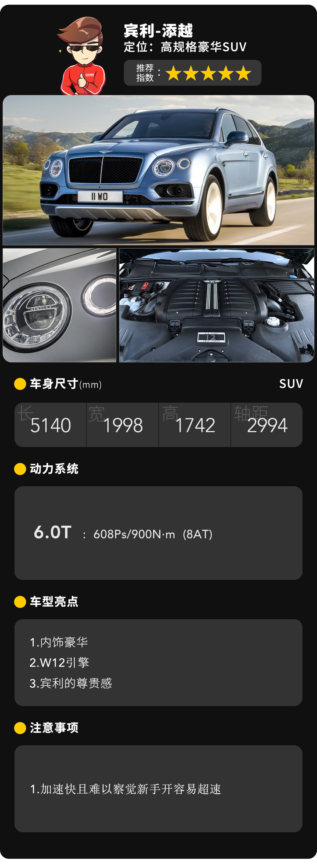 宾利的雍容华贵很好的继承到添越身上,并且它拥有一切宾利传统的同时实力也跟Cayenne Turbo S在伯仲之间,因此它的出现便一把从保时捷的手上夺过最强SUV的称号!无可挑剔是世人给它的评价,无论作为一辆实用性的载具,还是有灵魂的驾驶者之车,它总能样样具到给你最高级的享受!