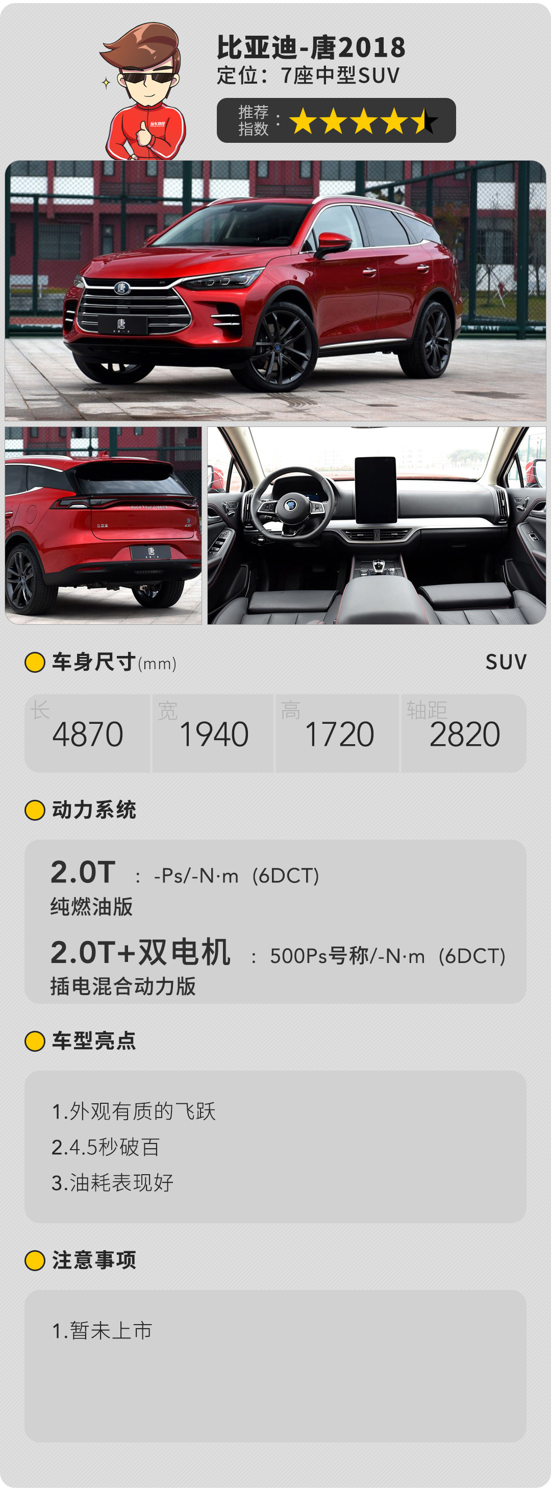 作为7座SUV能在4.5秒破百,即使纵观国际也属于非常优秀,而它拥有80-100KM的纯电续航能力,百公里2.0L油耗的账面数据更是逆天的存在,但还要等待上市后市场进一步的考察。不得不说比亚迪玩“电”确实在行,而且全新的颜值会让唐加了不少分!相信它的市场前景还是很有未来的!