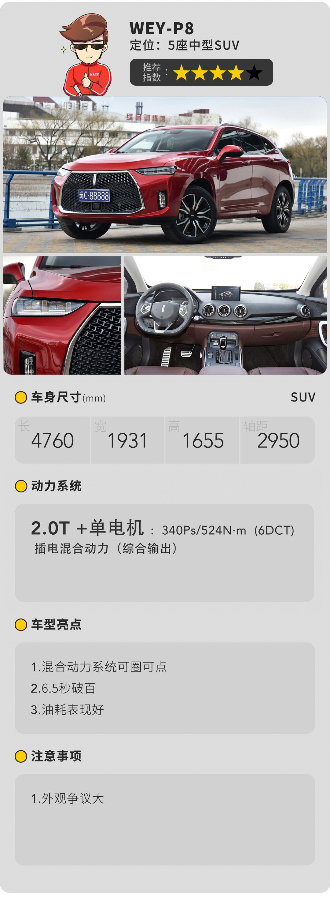 P8作为WEY新能源汽车的开山之作,其实力也不容小觑!6.5秒破百,50KM的纯电续航能力,通过家用220V电源4小时便可充满电,综合百公里油耗为2.3L,这一切都让它拥有优秀的能力立足于国际!另值得一提的是它日前向媒体展示公开成功挑战美规80km/追尾碰撞测试!安全性能值得信赖!可以预期它在5座新能源SUV领域里面绝对是一个优秀的性价比之选!