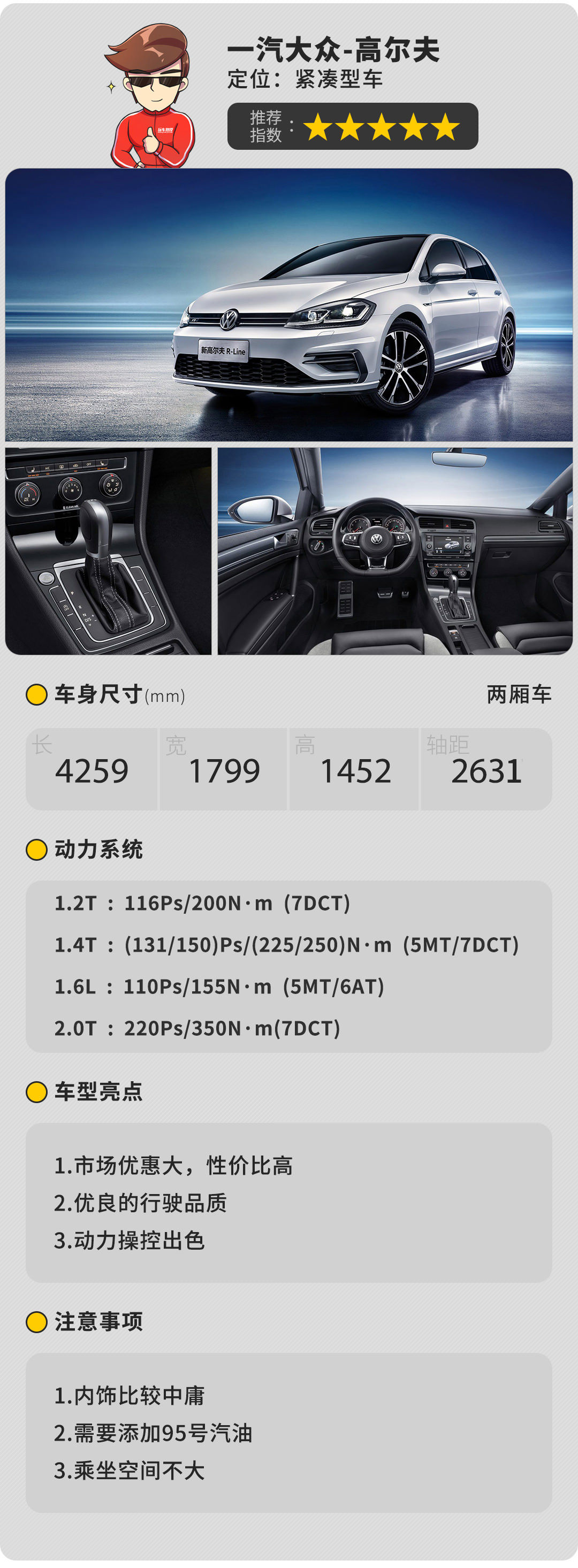 高尔夫在人们心中一直是一款经典的车型,紧凑的外观加上良好的操控使得它成为许多年轻人心目中的信仰,目前高尔夫已经发展到7.5代,以性价比较高的R-line车型为例,采用的是1.4T+7速双离合变速器的搭配拥有充沛的动力输出以及干脆利落的换挡表现,S挡之下会有更加暴力的输出,同时后悬架改为四连杆独立悬架,对于车辆的动态表现有很大的提升,是一辆非常均衡的驾驶者之车。