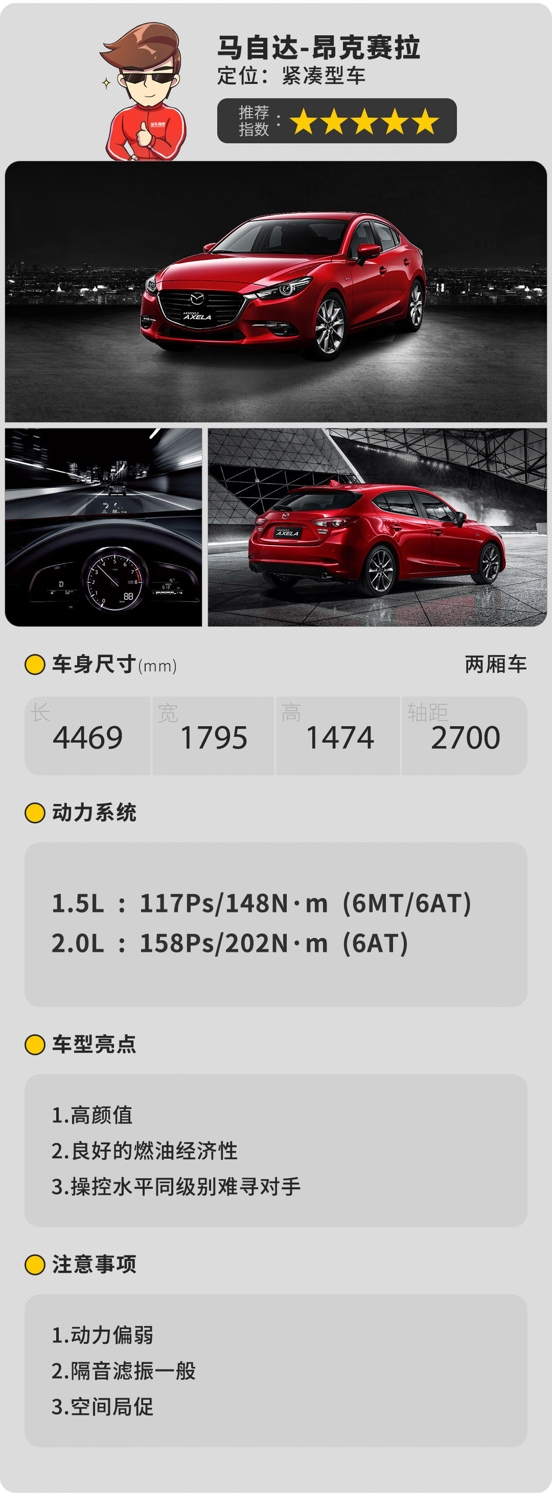 说到操控就不得不提马自达了,这个品牌对于技术和运动有着近乎变态的坚持,不仅是旗下的轿车拥有优异的操控性能,连SUV都不例外。而今天我们要介绍的是马自达3昂克赛拉的两厢车型,外观采用魂动设计语言与紧凑的车身结合拥有着非常迷人的外观,其最大的亮点在于创驰蓝天整车技术,发动机拥有超高压缩比,变速器能够很好地预判驾驶员的意图,方向盘拥有清晰的指向性,同时偏沉稳的手感能够更好地体会到它的操控性,底盘韧性十足,能够提供很好的支撑性。假如你对操控有着极致的追求,那么昂克赛拉一定是不能错过的车型。