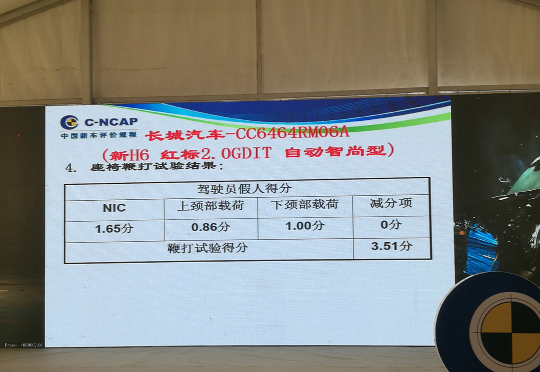 C-NCAP里共有四个项目:正面100%和40%碰撞,侧面碰撞,座椅鞭打。