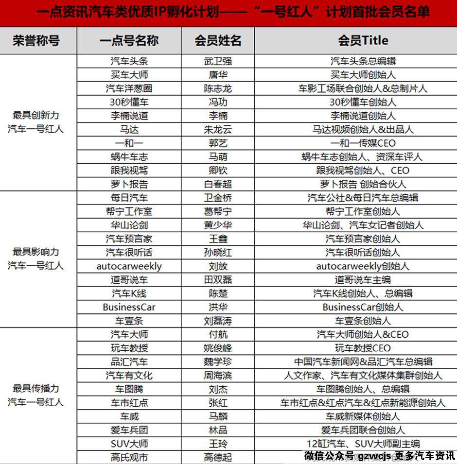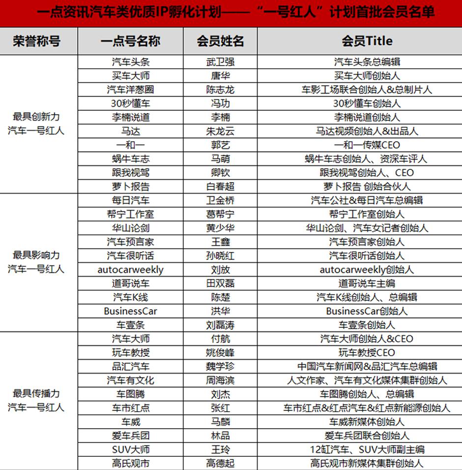 “一号红人”计划是一点资讯在自媒体红海时代下,打造的汽车类优质IP孵化计划,致力于通过亿级生态流量、百万点位曝光、内容变现加速和品牌价值升级等丰富平台资源和多项战略举措,帮助优质汽车类一点号成长为名利双收的“一号红人”。