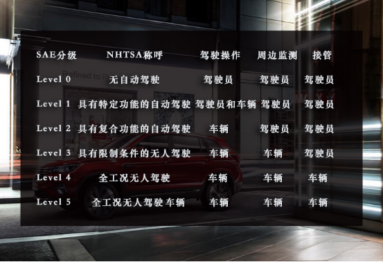 美国高速公路安全管理局(NHTSA),及美国机动车工程师协会(SAE)将汽车自动化定义为5个级别,目前为止,绝大多数在售车型基本处于L1级别,而长安CS55与睿骋CC已经搭载L2级别无人驾驶技术。