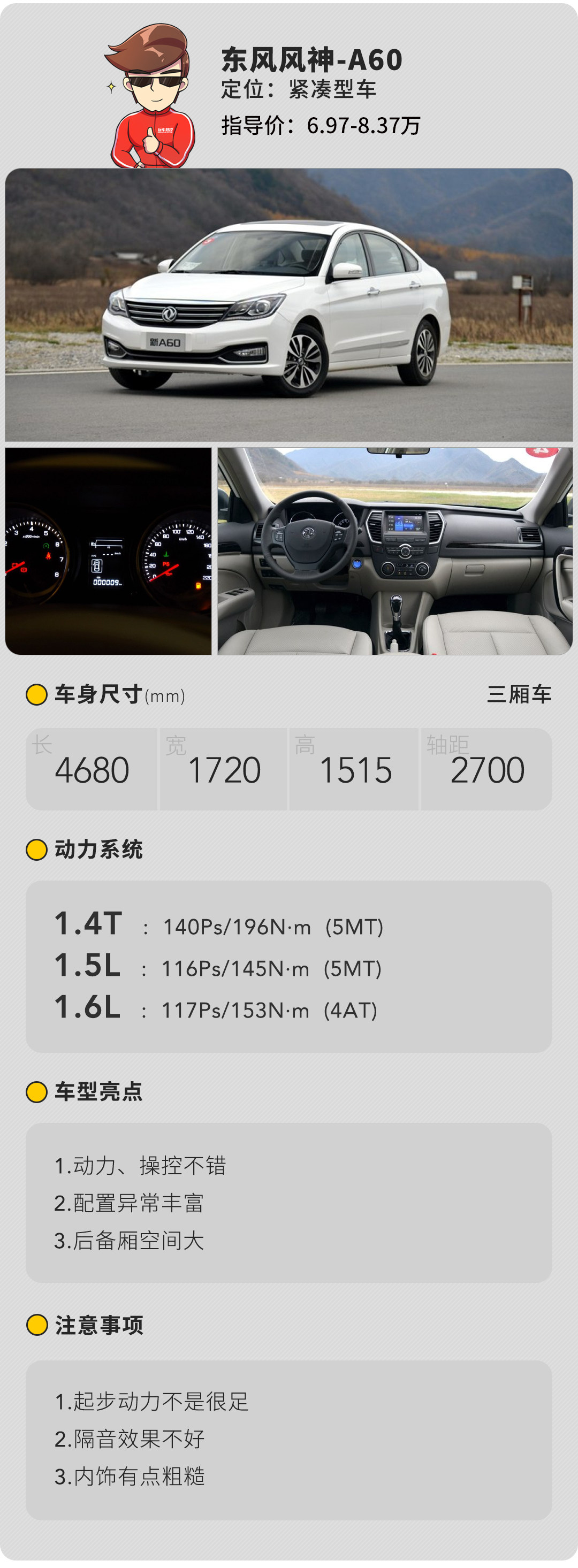 东风风神得益于和日产之间的关系,A60和日产的轩逸外观相似之处很多,底盘悬挂使用的也是同套底盘技术,设计细节也是如出一辙,具有相当高的可靠性,而调校也是偏向于舒适性,对于普通的家用轿车来说是比较合适的。与此同时,风神A60在内饰配置上也下了不少的功夫,整体性价比还是不错的。不过A60的动力表现有点欠佳,起步时的动力偏弱,对于驾驶感受存在影响。