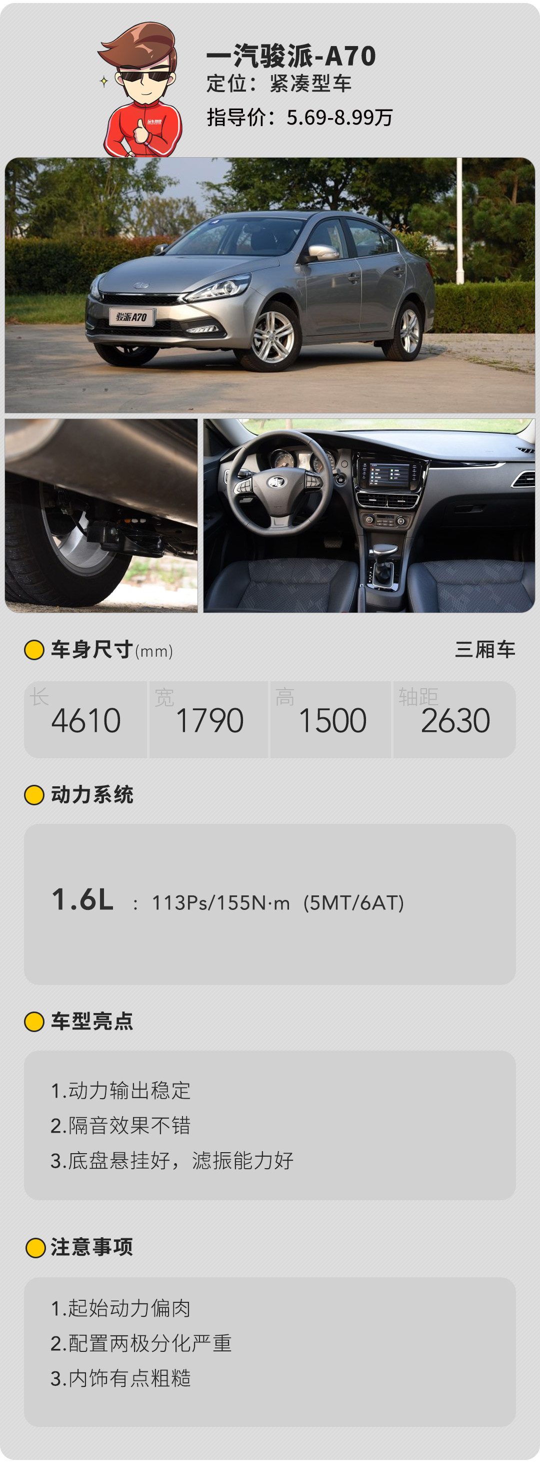 骏派A70和大众属于同平台共线生产,底盘悬挂承接了大众的优秀水平,拥有不错的滤振能力和较好的隔音降噪效果。而不到10万元的售价也是非常的优惠亲民。不过售价虽很实惠,换来的却是ESP这些主动安全配置就只有高配车型才会有,整体性价比虽未大幅递减,但是竞争优势有所下滑。