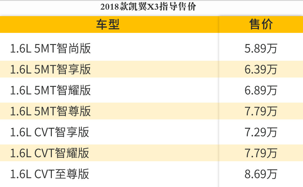 2018款凯翼X3于4月28日正式上市销售,新车共推出搭载1.6L发动机的共计7款车型,售价为5.89-8.69万元。