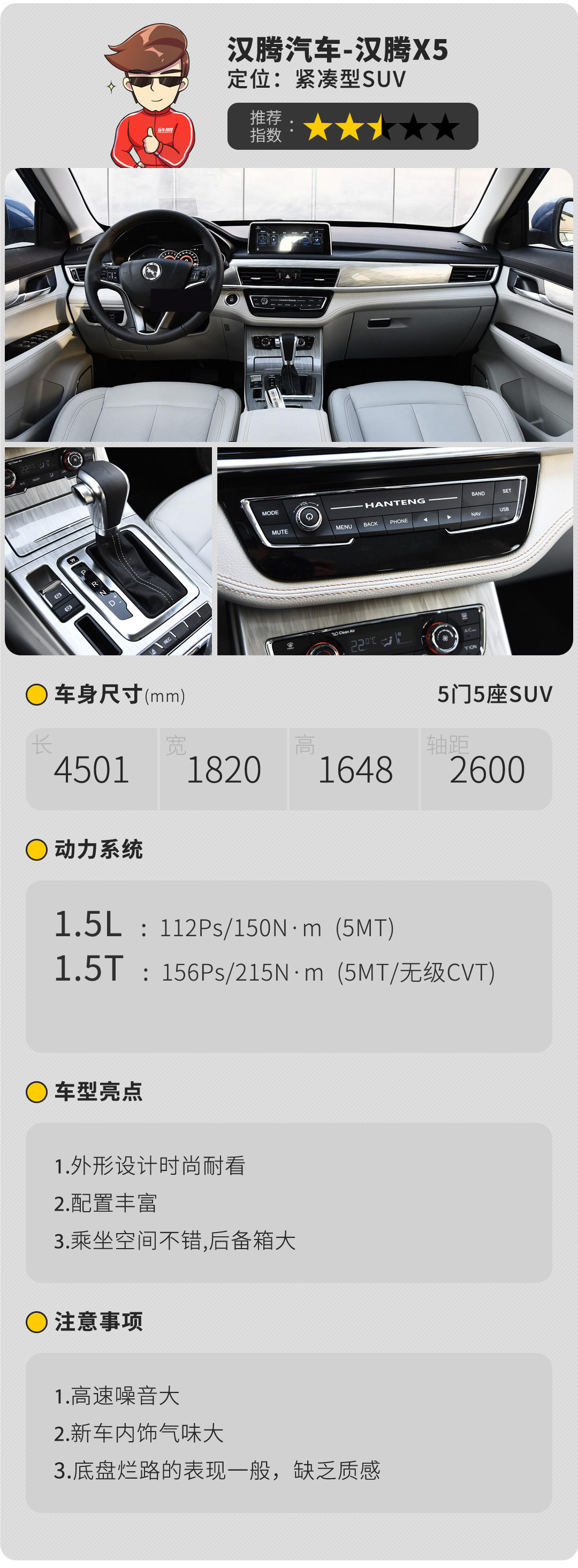 作为汉腾的第二款车型,X5在外观上比X7更显年轻动感,并且原创度要更高,前脸精致度不错,设计耐看,比较符合大众口味,侧面采用了悬浮车顶的设计,增强了时尚感,而尾部造型紧凑,尾标采用汉腾的拼音,整体简洁大方。