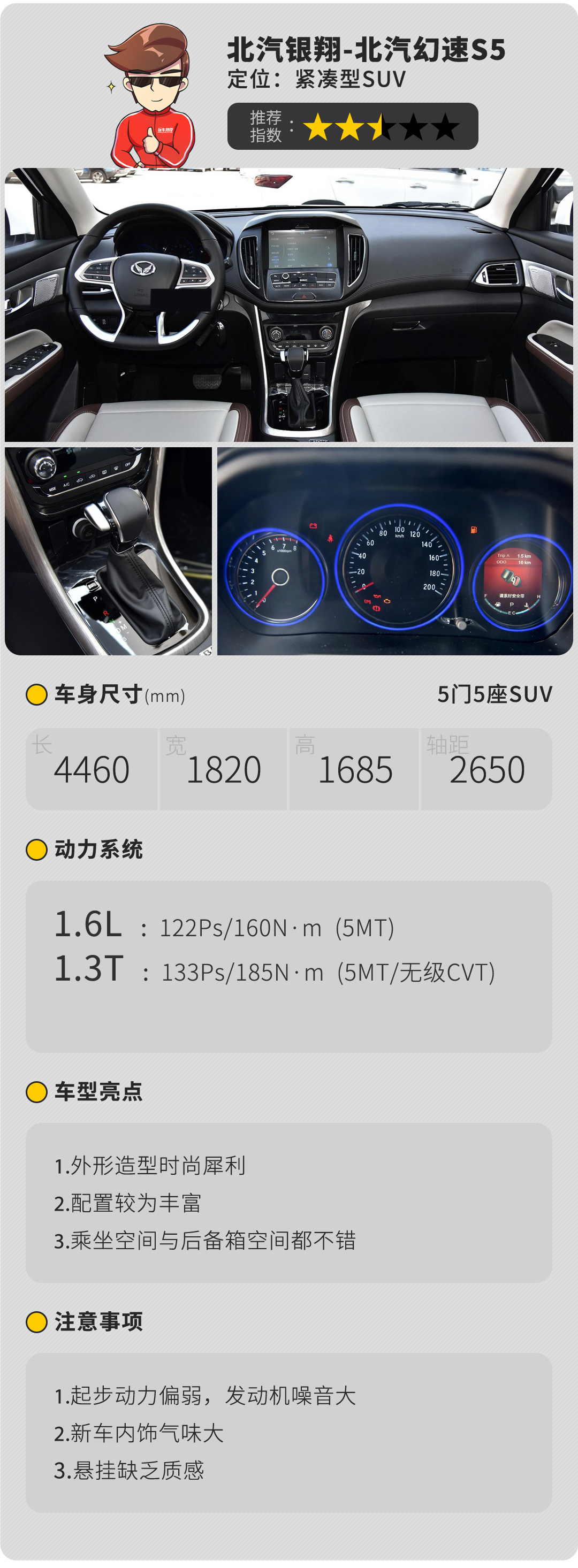 相较于外观和内饰,在动态表现上并没有给人太多惊喜,动力输出不紧不慢,没有什么特定的爆发点,6AT的变速箱在频繁切换挡时会有明显的顿挫,偏舒适的悬挂对细碎路面处理还算得体,遇到大的颠簸路面时表现也不至于松散。