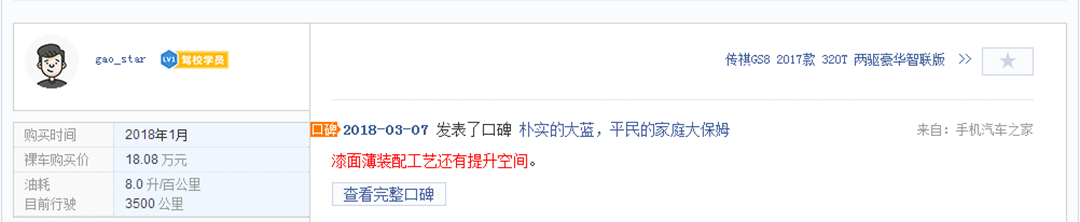 那么,在这么多优点之下,GS8需要留意的地方是什么呢?首先是中控屏,这是很多人吐槽的地方,倒车影像的模糊,显得与内饰氛围不搭;然后是车漆较薄,许多车主会跑去另外做镀晶,这就让人觉得不够省心。