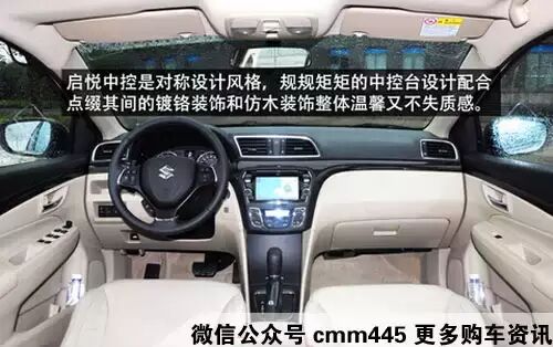 内饰方面,长安铃木启悦内部采用了黑色和米色的搭配,中控台设计十分简洁。在配置上该车将搭载ESP车身电子稳定系统、TCS牵引力控制系统、GPS导航、倒车影像、定速巡航、无钥匙进入等等。另外,车内还配备了独立后排空调出风口、防紫外线后排遮阳帘等。