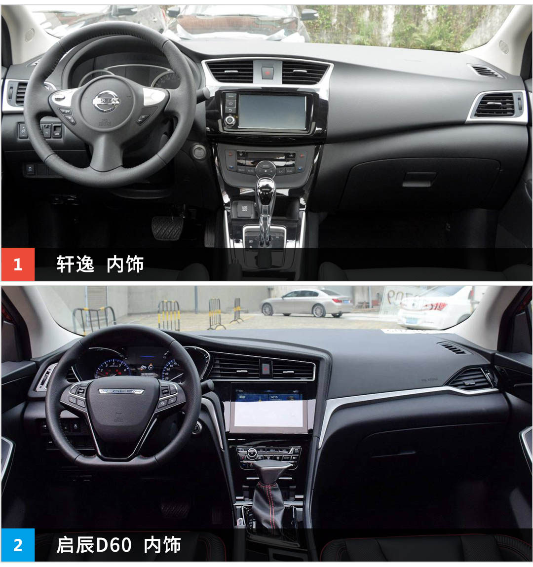 内饰上,启辰D60采用非对称驾驶台、平底方向盘。另外用银色饰条做装饰,显得中控台层次分明,轩逸内饰相对简单,按键分区明确,典型的居家风,带来轻松的氛围。