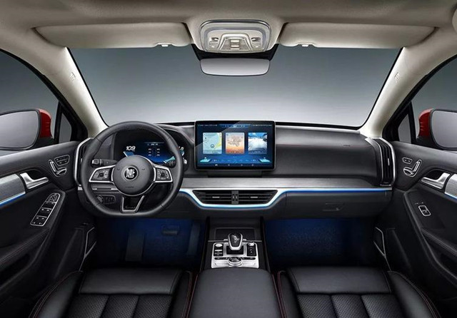 内饰同样话题性十足,其中最抢眼的部分当属中控可90°旋转的超级大屏,同时全液晶仪表和蓝色氛围灯增加了车内的科技感。