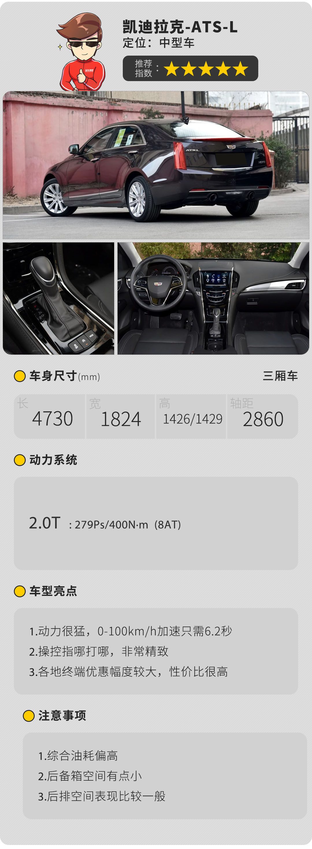 其实相对于操控,其实ATS-L的动力表现才是最核心的优势,同级中已经达到顶尖水平,2.0T发动机,279匹最大马力,以及400牛米的最大扭矩,百公里加速只需6.2秒。就凭它的动力,我就认为它已经物超所值了。