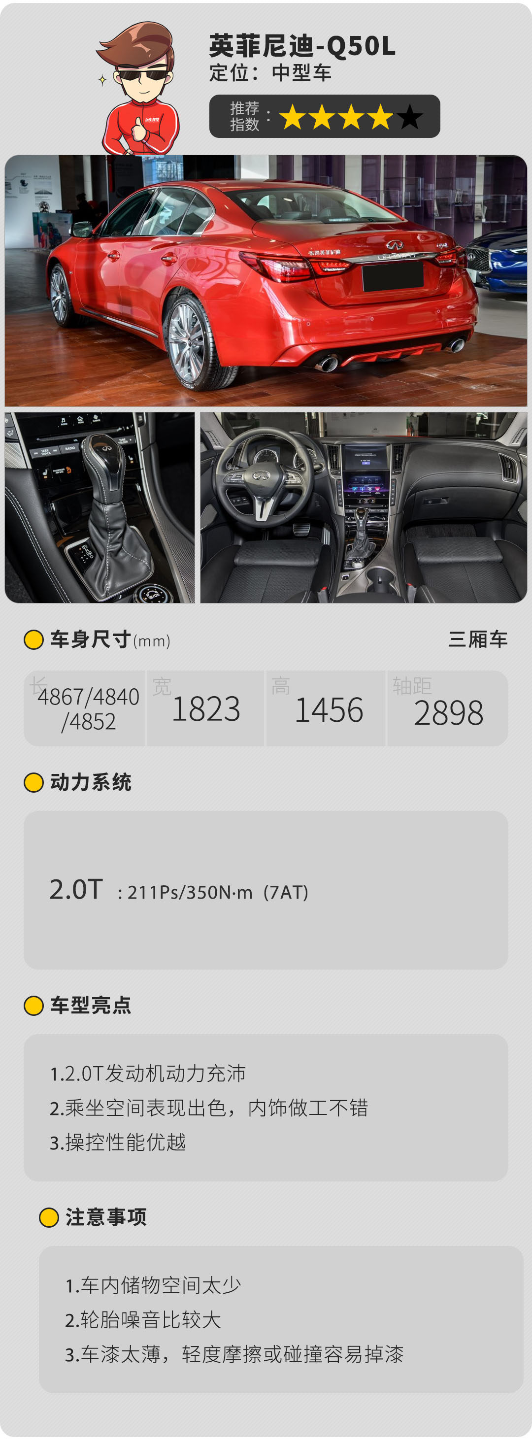 现款Q50L全系配备2.0T发动机,动力参数只能算中规中矩,不过前双叉臂和前置后驱的布局,还是很能体现出其运动特性的。不过相对而言,其实英菲尼迪Q50L除了运动外,也非常注重豪华,因为英菲尼迪这个品牌本质就是日产旗下的豪华高端品牌。