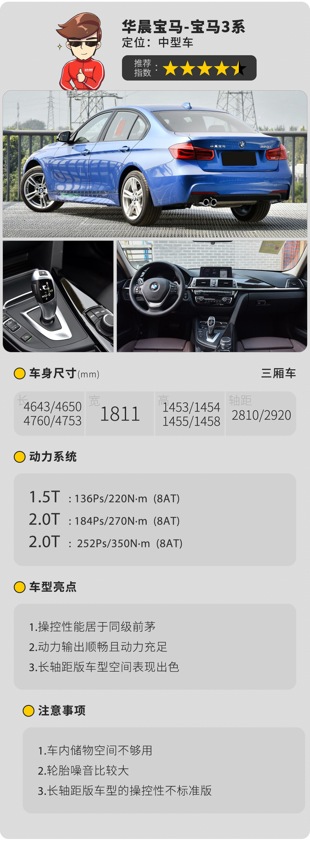 虽然3系国产后更许多许多入华的车型一样,都推出了长轴距版的车型,但在现款车型中,华晨宝马仍然把标准轴距版的车型保留了下来,虽然长轴距版的一直都是中国市场的主流,当然它的实用性也比标准轴距版更强。但在操控方面,标准轴距版还是更被消费者认可。