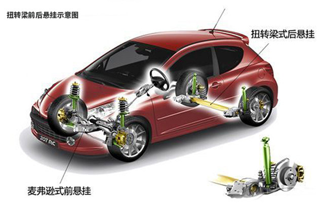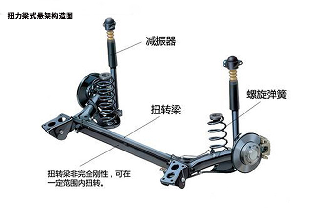 结构组成:扭力梁悬挂由非完全刚性的扭力梁和减振器以及弹簧组成,严格性的来说,扭力梁悬架也属于半独立式悬挂。