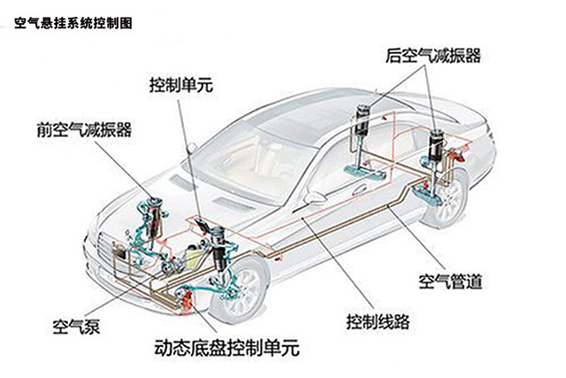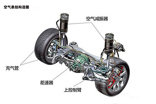 结构组成:空气悬挂主要由空气泵和空气减振器两部分组成,日常是通过控制空气泵中的空气量来调节空气减振器的长度和行程,进而实现对底盘高度的调节控制。