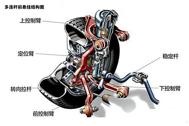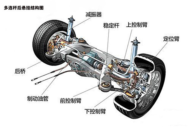 结构组成:多连杆悬挂就是通过各种连杆把车轮与车身相连,连杆数比常规悬挂要多,目前的多连杆悬挂多为4连杆或5连杆,前悬挂一般为3-4杆,后悬挂多为4-5杆。