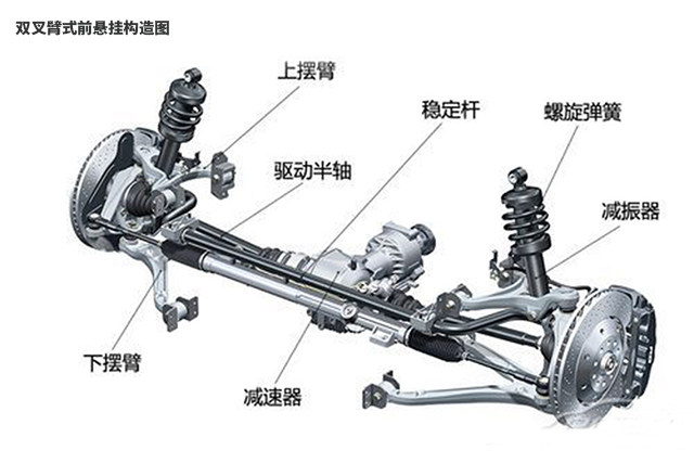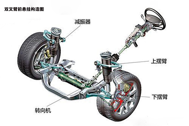 结构组成:顾名思义,双叉臂悬挂主要由双A臂和双横臂两部分构成,此时的减振机构就只负责支撑车体以及减振,稳定车身等任务就由双叉臂负责。