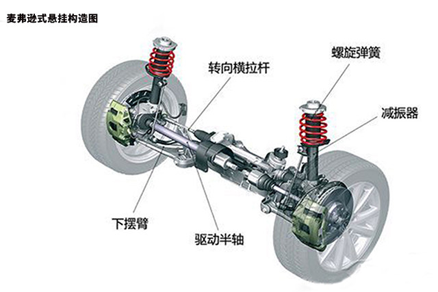 结构组成:麦弗逊是最为常见的一款悬挂系统,主要由A型叉臂和减振机构组成。叉臂与车轮相连,主要承受车轮下端的横向力和纵向力;而减振机构则主要承担减振和稳定车身的任务,接收车轮上端所产生的横向力。