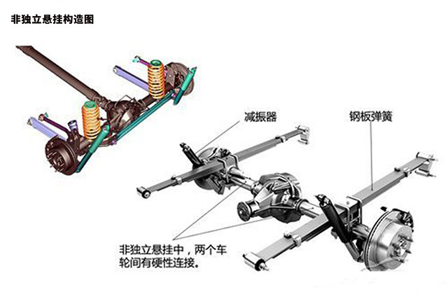 而非独立悬挂则恰恰相反,硬性物相连的两轮并非独立,属共生关系,但其具有结构简单,超强的刚性和通过性特点。