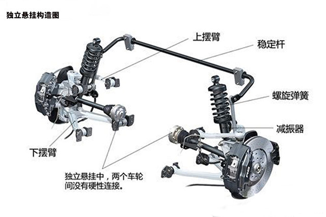 独立悬挂左右两轮无刚性连接,互相间无干涉影响,具体表现为可有更好的舒适性和操控性;