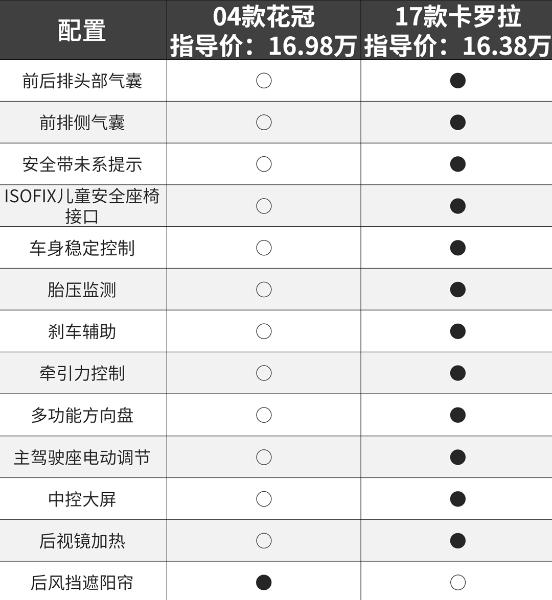 现款卡罗拉仅在高度上要稍稍吃亏,其他方面的车身尺寸都是占优的。配置上,同样是大幅领先于老款花冠。其中最重要的还是安全配置方面的提升,这能有效降低发生事故时的死亡率。