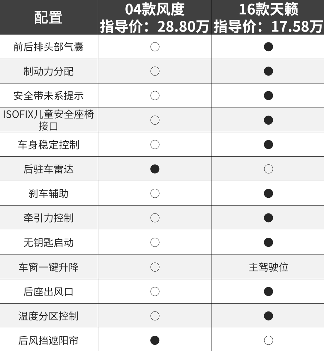 通过这三组对比,我们都能发现新车相比老车在机械的完善度方面会更加高,同时相同价格下的配置也要更为丰富,尤其是安全配置。而天籁虽然与风度在机械表现上差距不大,但入手门槛却得到了大幅降低,这都是汽车发展得越来越好的有力证据。